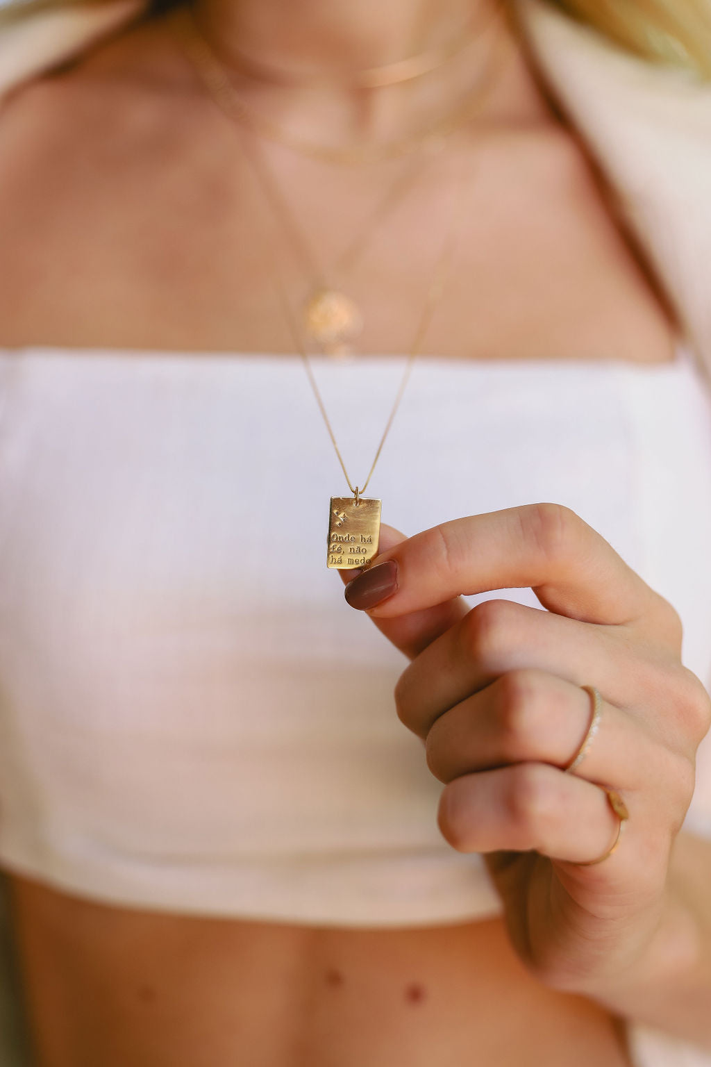 O Pingente Essencial, feito em ouro 18k, é uma joia sofisticada com design minimalista e formato retangular. Ideal para personalizar com palavras, datas ou mensagens especiais, é uma peça elegante, cheia de significado, perfeita para uso diário ou como um presente marcante que encanta e emociona.