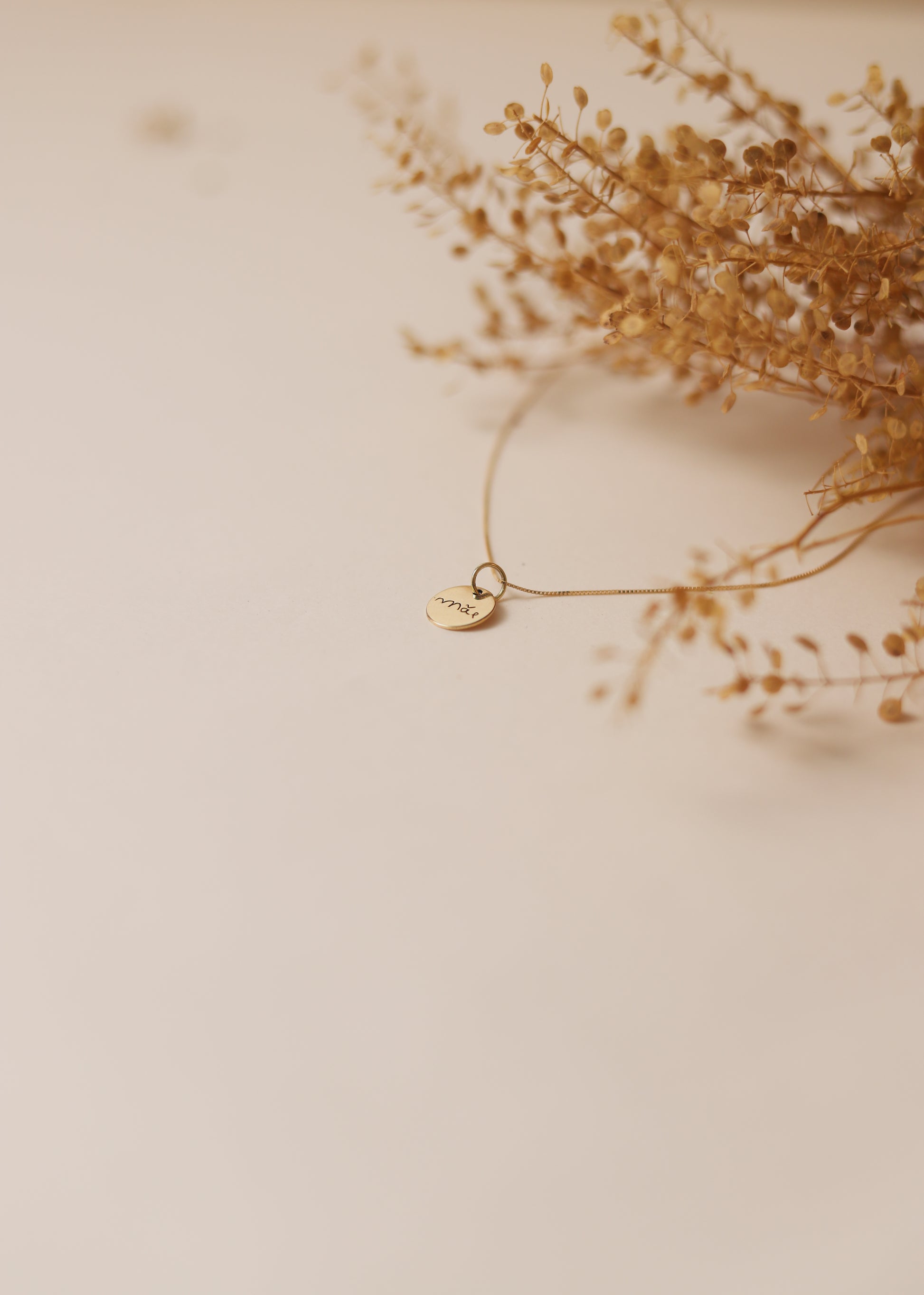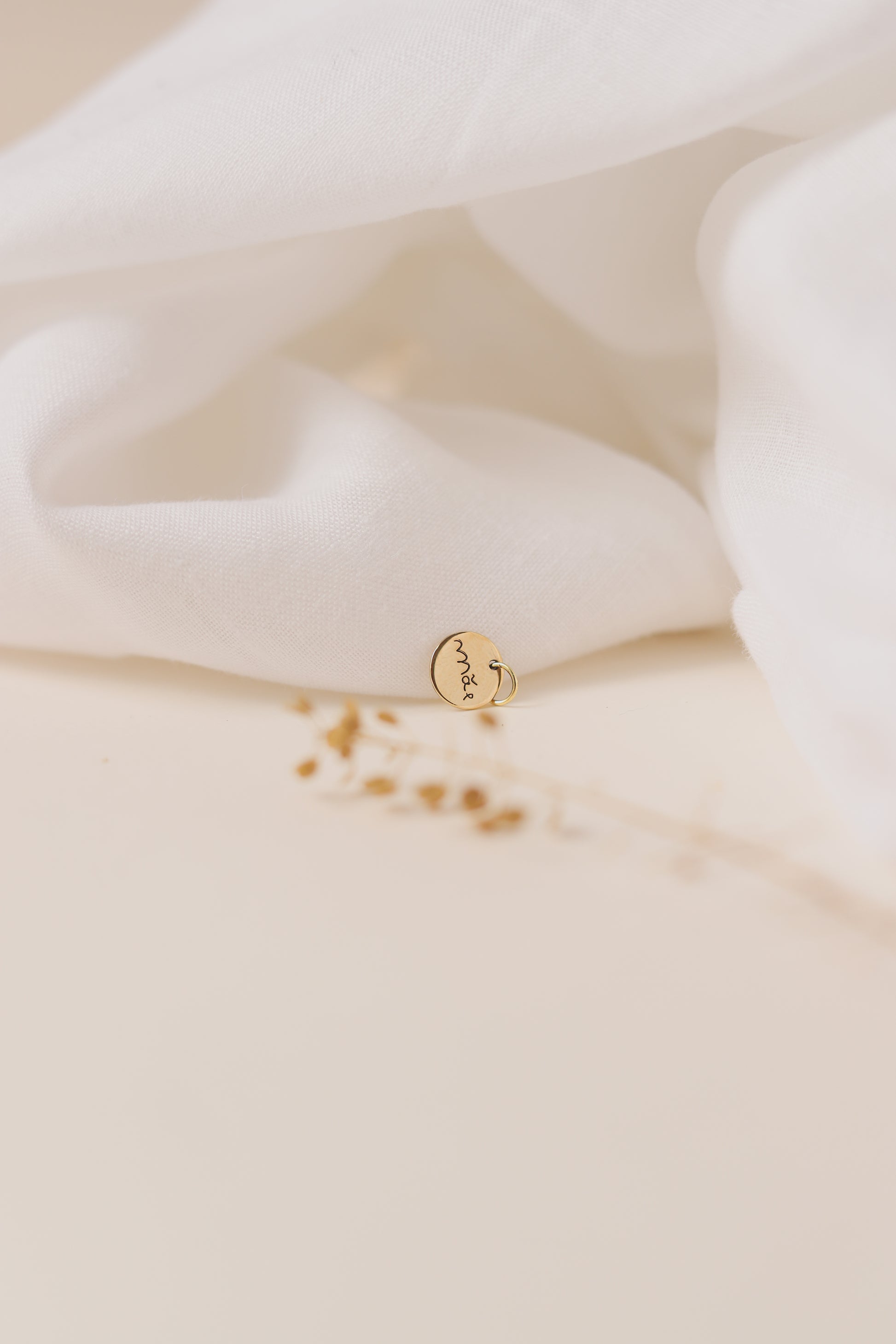 Essência: uma joia em ouro 18k, com 10mm de diâmetro, que pode ser personalizada com símbolos, números, letras ou desenhos especiais. Transforme memórias e sentimentos em um amuleto único, refletindo sua essência de forma autêntica e sincera.