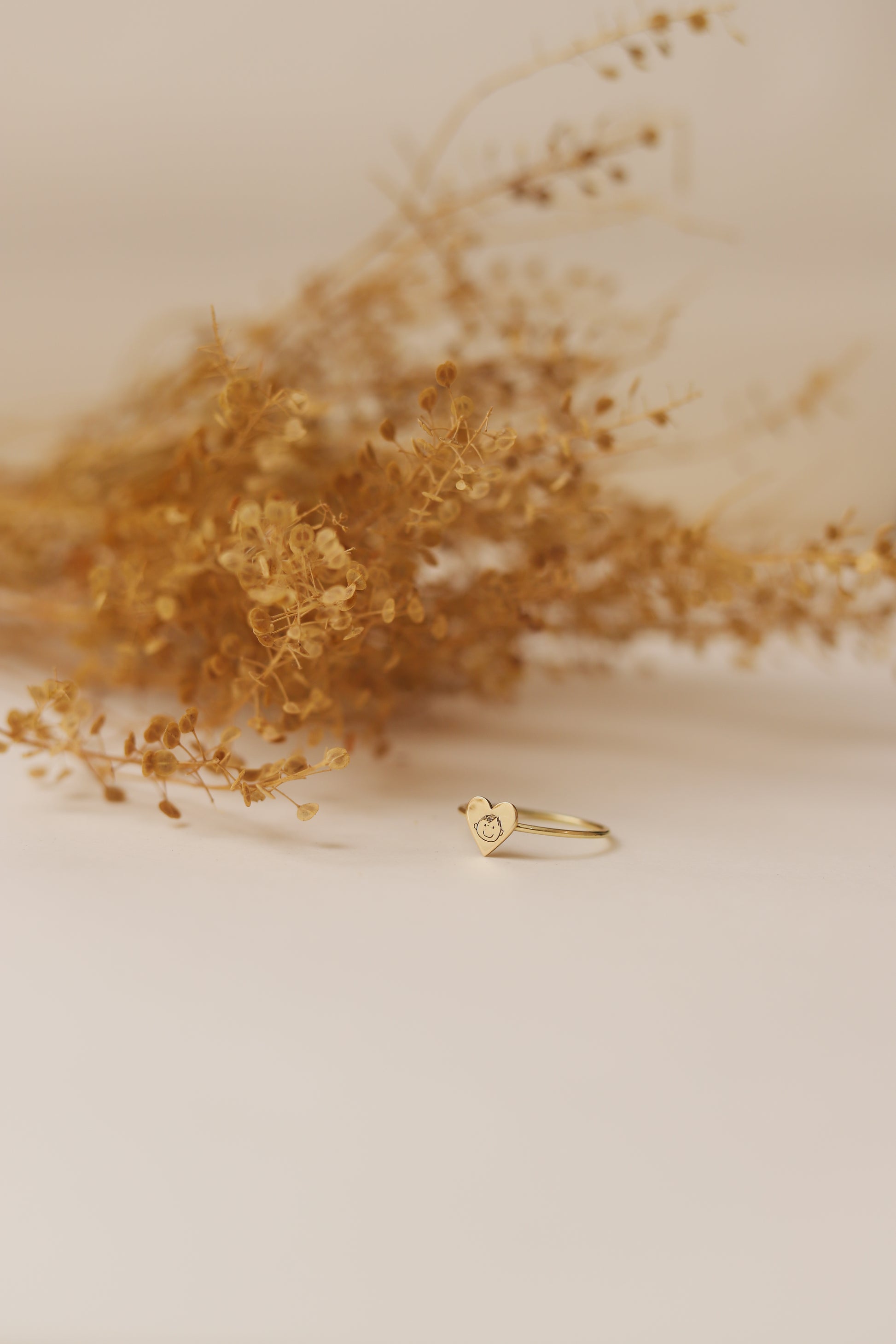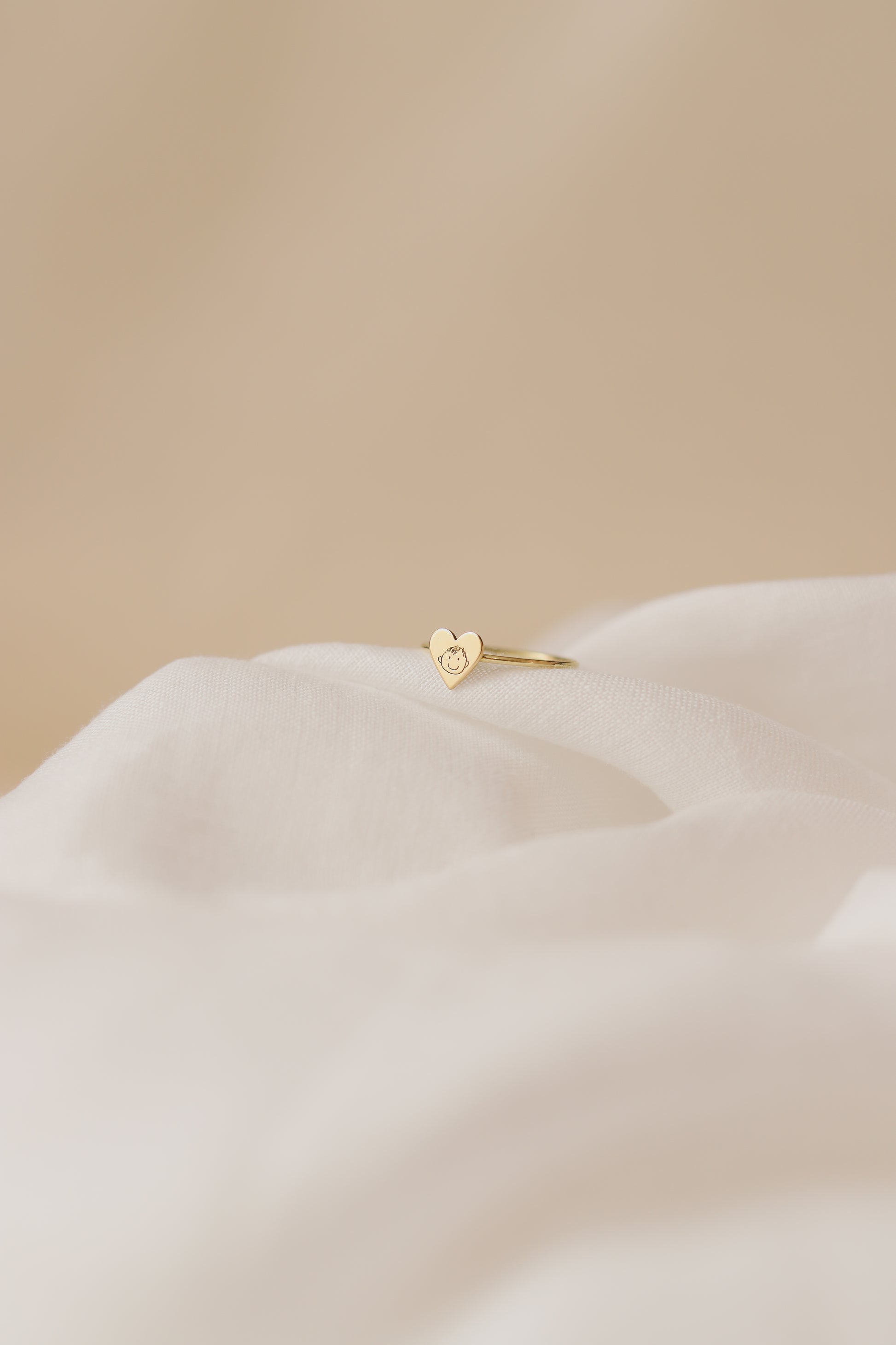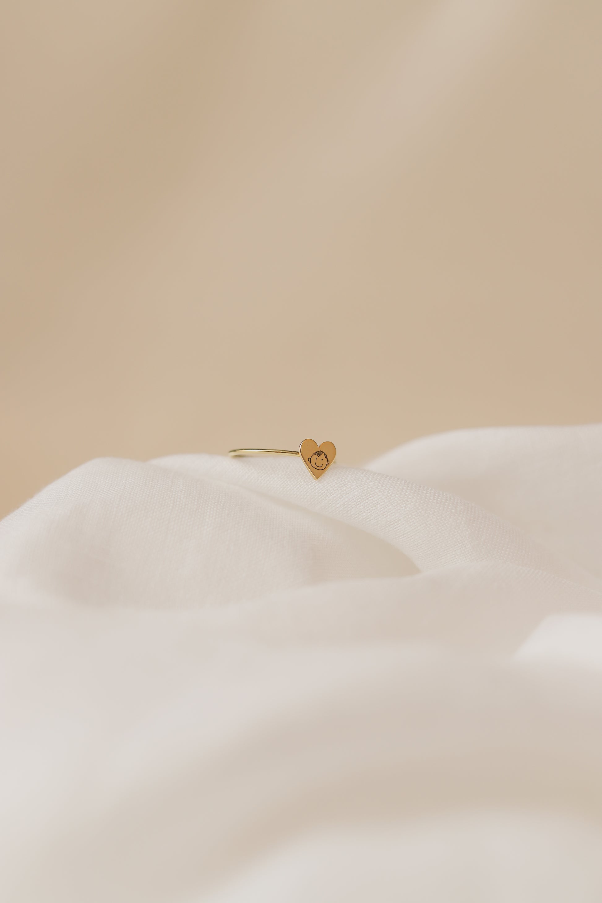 - Confeccionado em ouro 18k, o Anel Afeto está disponível com placa redonda ou em formato de coração.